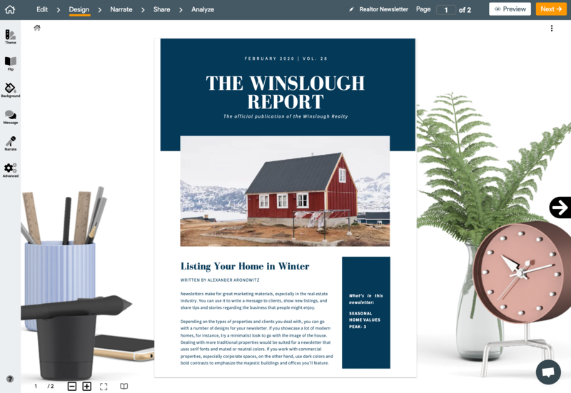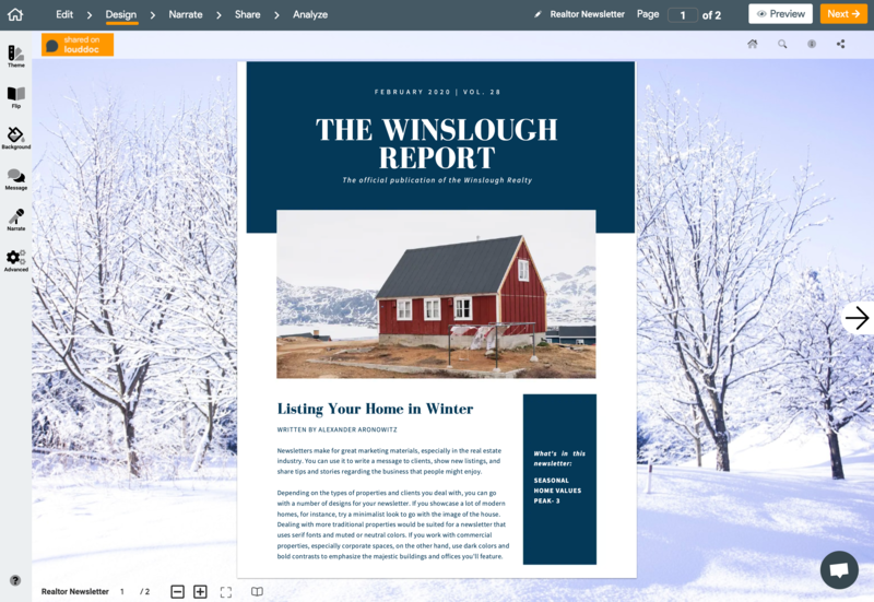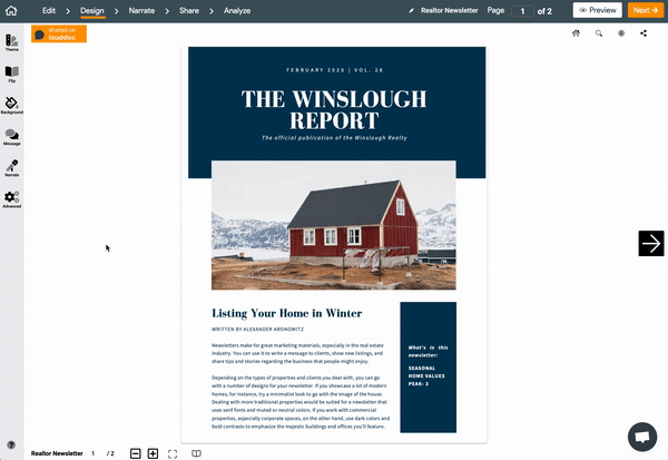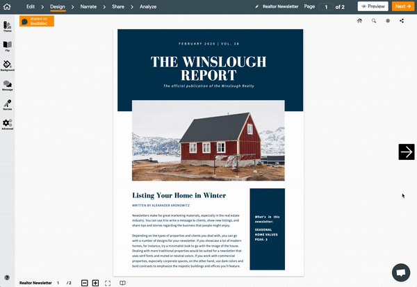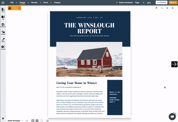 Customizing your LoudDoc's presentation takes place in the DESIGN tab. Here is where you'll easily customize your logo, background, supporting navigation menus, and how your LoudDoc flips from one page to the next.