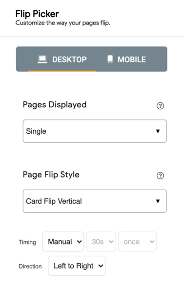 From the DESIGN toolbar, select the Flip button . You can select from multiple page transitions, including how many pages are shown at any one time and the style of the page flip. Tap the done button and your page transition will be automatically applied to your LoudDoc.
