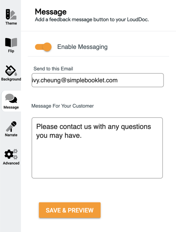 Feedback from your audience is a critical part of establishing a personal relationship. We've made it easy for you to get instant feedback from your customers using a chat style messaging button you can add directly to your LoudDoc presentation.