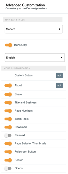 You can toggle on or off which Navbar menu buttons and features appear on your LoudDoc. Simply go down the list and toggle on or off the buttons you want to appear or be hidden.