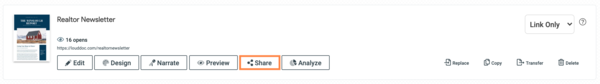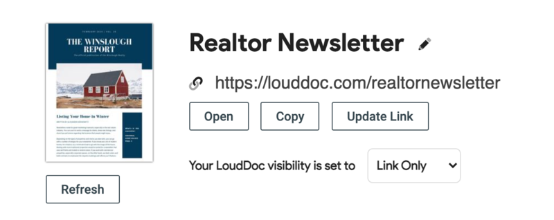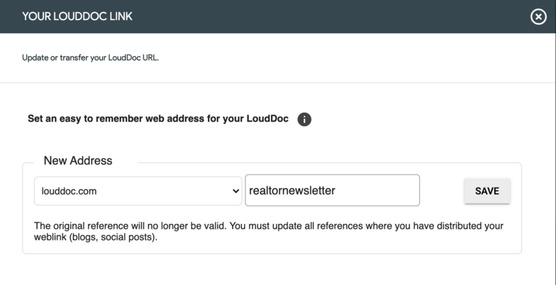 Every LoudDoc has a weblink that is unique. The weblink is displayed with a thumbnail image of your LoudDoc cover at the top of your share tab.