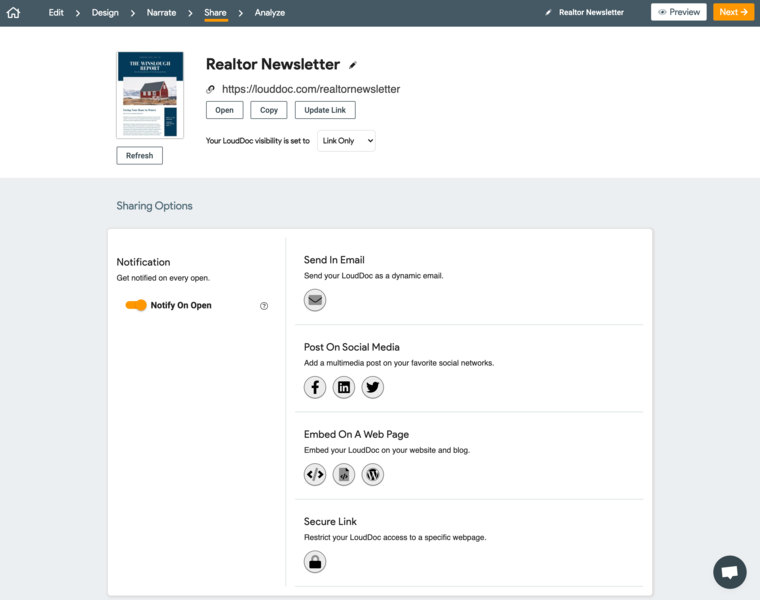 The share tab is customized for the current LoudDoc. From here, you can access and manage your LoudDoc link, manage your notifications, and use prebuilt integrations to send in email, post to social networks, and embed on your own website.