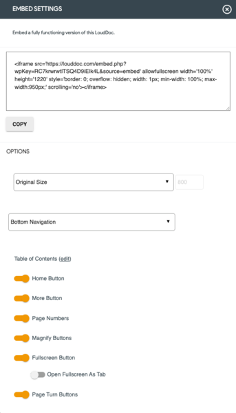 Beneath Options are many different aspects that can be customized to change the appearance of your embedded presentation. Such as changing the document size, and customizing navigation buttons. Many of these options are dependent on how you would like your LoudDoc to be presented.