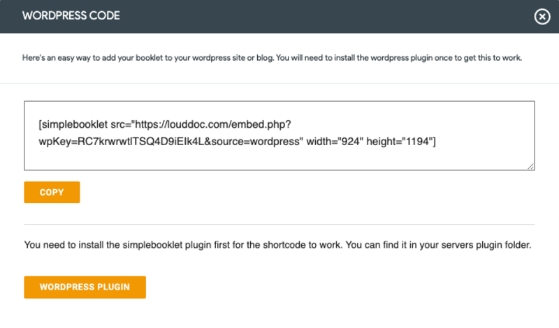 Click to be directed to the Wordpress Code tab. You'll have the option to copy the code given in the box above into your Wordpress HTML editor or install a shortcode through the Wordpress plugin on LoudDoc.