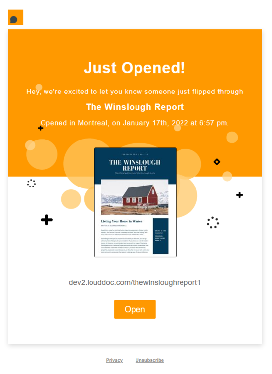 By default, we'll notify you whenever your LoudDoc is opened. You'll receive an email with the date, location, and time your LoudDoc was viewed. You can turn off notifications by toggling off the Notify On Open tool.